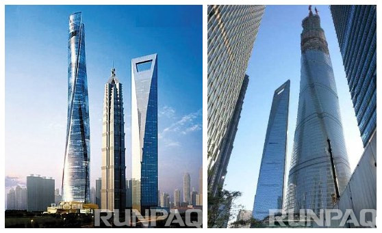 圖1、上海中心效果圖(左一位上海中心大廈) 圖2、上海中心施工現場