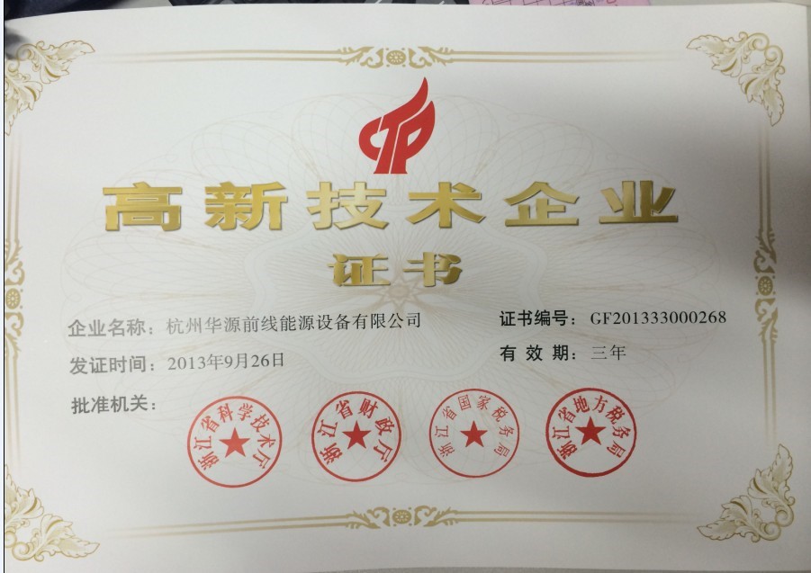 近日,杭州華源前線能源設備有限公司順利通過省科技廳國家高新技術企業復審,資格有效期延至2016年9月。 華源前線公司每年投入較多研發工作和研發經費,保持在生物質鍋爐、電廠電站輔助鍋爐、風電蓄能鍋爐、電鍋爐灰渣輔機系統等領域的技術先進性,并獲得國家火炬計劃項目、重點產業支持項目、科技創新服務平臺等一批國家支持獎勵項目和科研任務。公司在引進高技術人才和技術產業化等方面探索出一套行之有效的管理模式。 高新技術企業復審工作,考察企業自主知識產權創新能力、科技成果轉化能力、研究開發組織管理水平以及企業創新發展成果等核心指標的達成程度,評估企業的科技創新能力與發展水平,確定企業是否繼續保持高新技術企業的特征和能力。此次復審通過,反映出了公司近3年在各主要考核方面繼續保持著進步和發展,公司高新技術企業的特征得到了權威機構的認定。