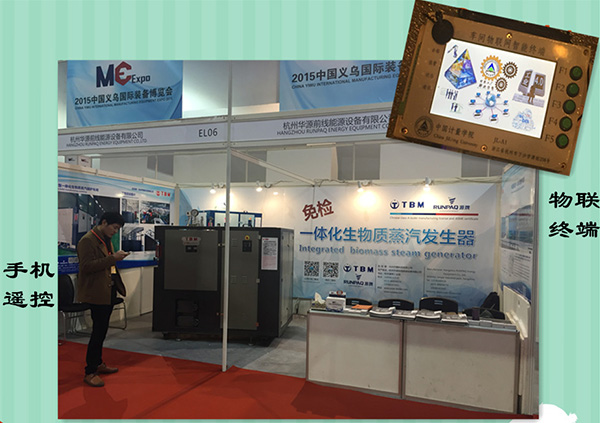 2015年11月30日到12月3日,免檢型一體化生物質(zhì)蒸汽發(fā)生器亮相義烏國(guó)際裝備博覽會(huì),和著互聯(lián)網(wǎng)+契機(jī),突出智能化成果,我們的參展產(chǎn)品除了自動(dòng)化程度高、安裝簡(jiǎn)單、環(huán)保排放等優(yōu)點(diǎn),還引入了物聯(lián)網(wǎng)概念,借助平臺(tái)終端和手機(jī)APP程序,可以實(shí)現(xiàn)對(duì)蒸汽發(fā)生器的手機(jī)遠(yuǎn)程遙控。