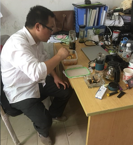 浙能黃巖熱電廠,華源前線輔助鍋爐現(xiàn)場辦公室內(nèi),一個(gè)褲腿、工作鞋上沾滿灰塵的眼鏡兄弟,正在快速往嘴里遞送泡面,看他大口吃得那么香,讓人不禁想,難道這是什么特制秘方泡面,有這么香嗎。