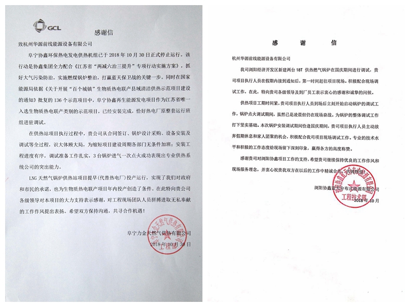 發(fā)來感謝信的業(yè)主一個(gè)是阜寧協(xié)鑫再生能源發(fā)電有限公司,一個(gè)是瀏陽協(xié)鑫藍(lán)天分布式能源有限公司。他們雖然同屬于協(xié)鑫集團(tuán),但一個(gè)在江蘇,是江蘇省唯一生物質(zhì)熱電聯(lián)產(chǎn)示范項(xiàng)目;另一個(gè)在湖南,是湖南首個(gè)經(jīng)開區(qū)分布式能源項(xiàng)目;相同的是他們都選擇了華源前線的SZS型水管式鍋爐作為主要設(shè)備。事實(shí)證明,華源前線鍋爐是他們明智的選擇!