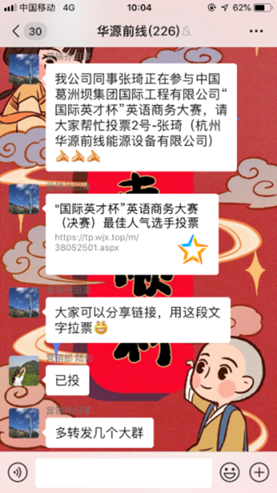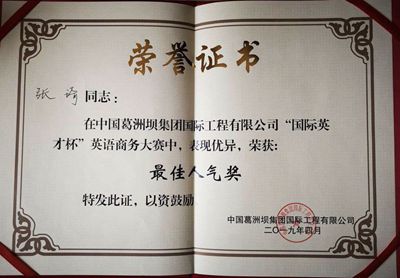 原來這正是對近期參加葛洲壩國際公司舉辦的“國際英才杯”英語商務大賽的張琦,授予“杰出青年”稱號的通報。張琦作為杭州華源前線能源設備有限公司的代表,在比賽中憑借出色的英語能力,良好的臨場應變能力,在高手云集的比賽中獲得“優秀獎”,并在網絡投票環節一舉拿下全場“最佳人氣獎”。