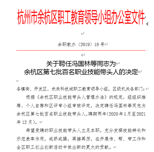 近日,公司傳來喜訊,生產部焊接一組王永同志榮獲余杭區第七批百名“職業技能帶頭人”稱號。
