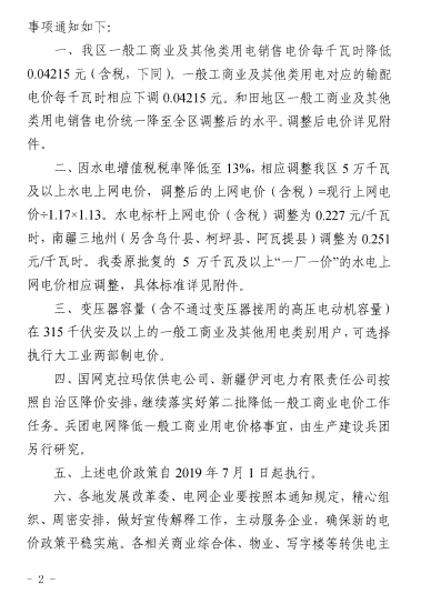 《通知》提出,國網克拉瑪依供電有限公司、新疆伊河電力有限責任公司按照自治區降價安排,繼續落實好此次降低一般工商業電價工作任務。兵團電網降低一般工商業用電價格事宜,由新疆生產建設兵團另行研究。